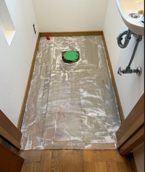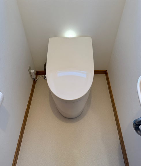 商品はTOTOのネオレストASです。お客様が以前に塩ビタイルをDIYで床に貼っておられましたが貼替たいとの事でめくり下地調整をしクッションフロアーを貼らせて頂きました。