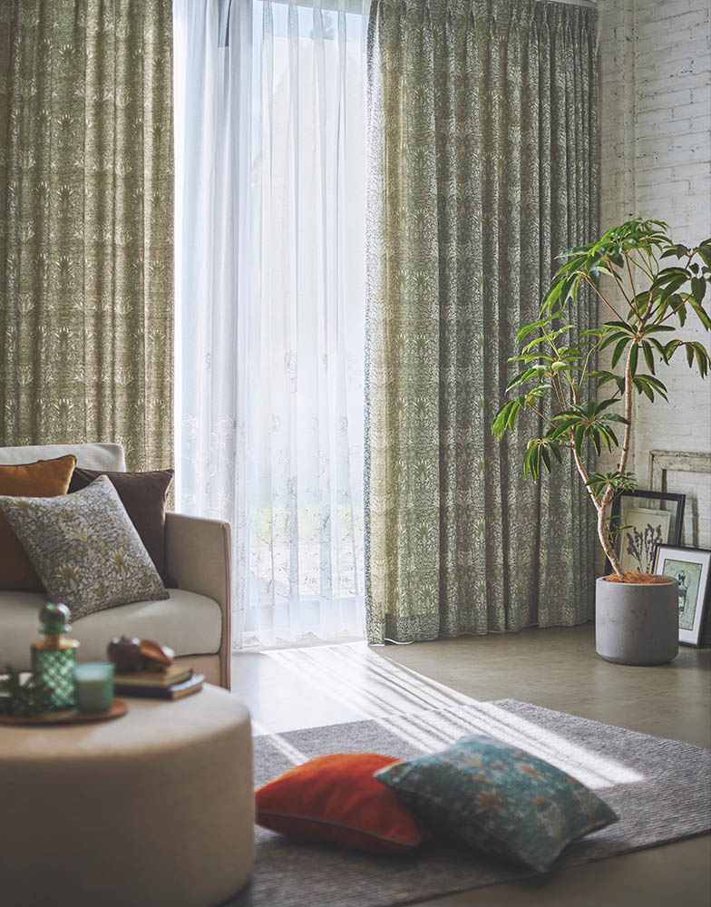 少し鮮やかな色をアクセントにして重厚過ぎないクラシック感とモダンさのあるカーテンです。