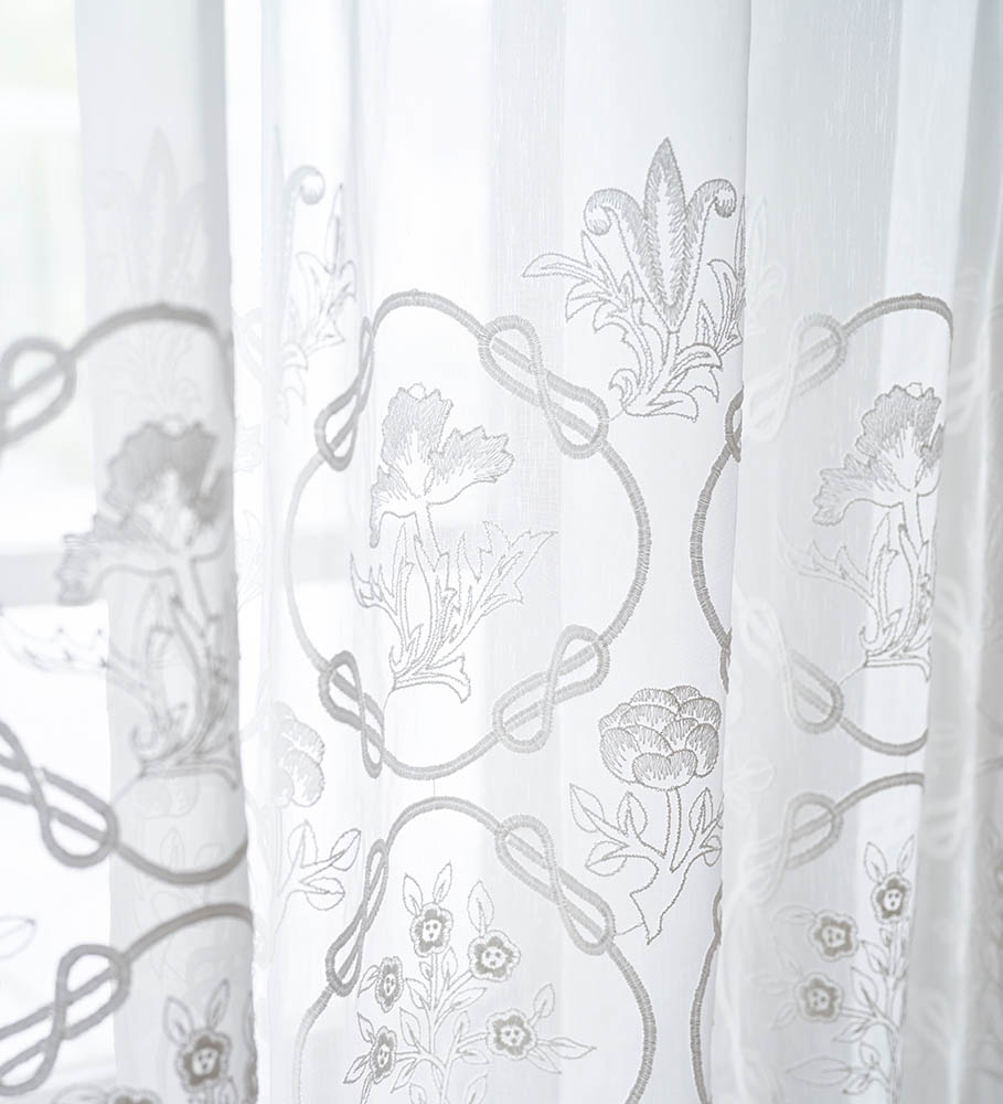 リネン地に撚りの甘いウール糸で施されたクルーエル刺繍の雰囲気を