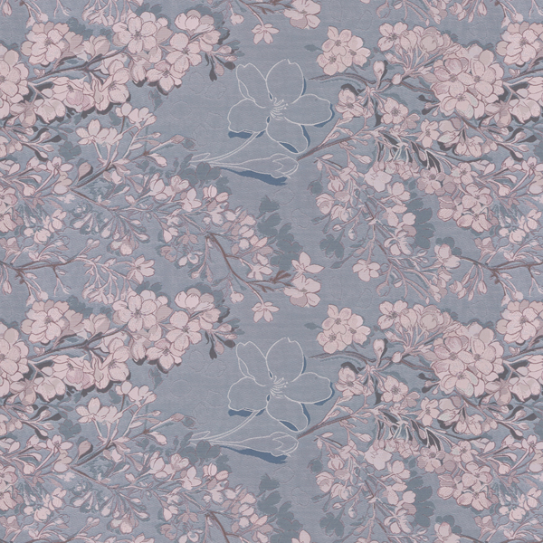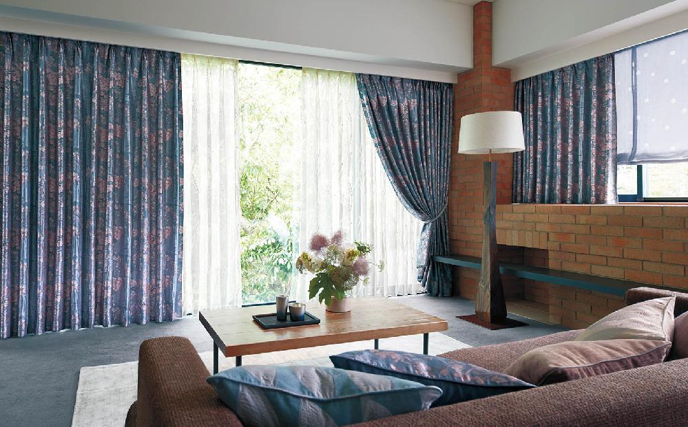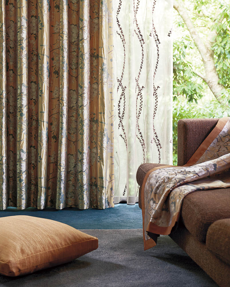 揺れ漂う桜の薄い花びらを、変化に富んださまざまなヨコ糸の織りを用い、淡いトーンで表現されたカーテンです。