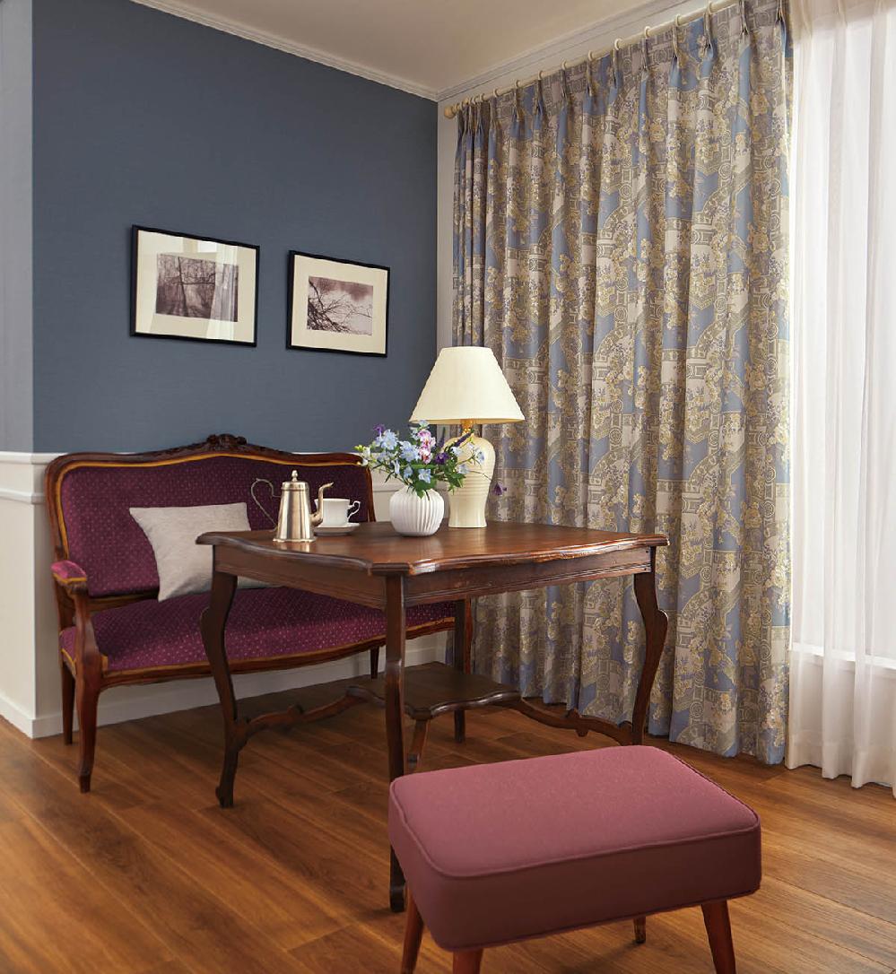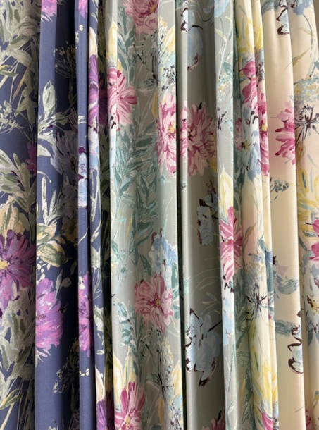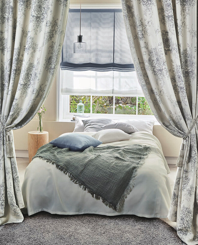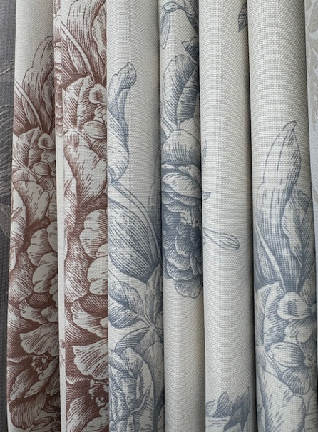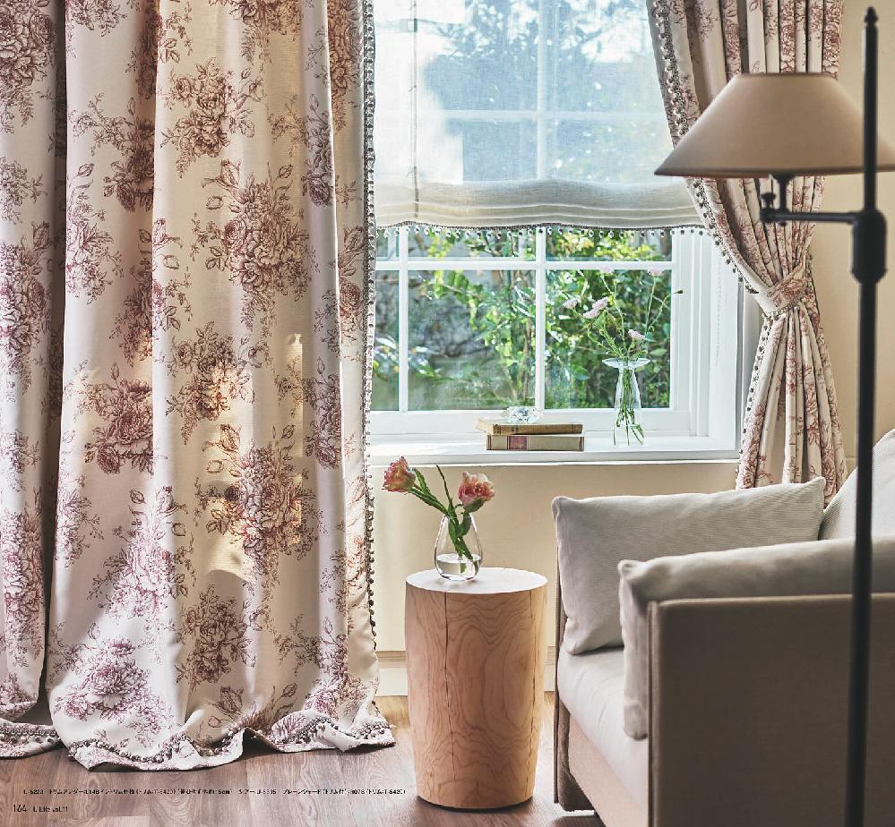 繊細に描いた花のブーケをプリントした遮光カーテンです。